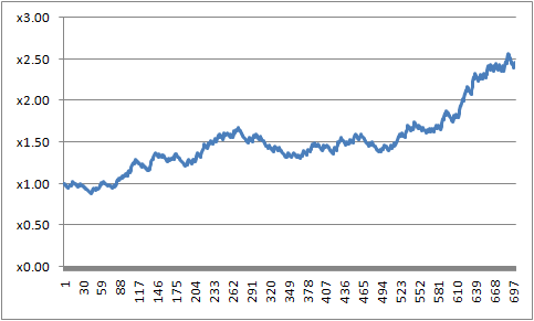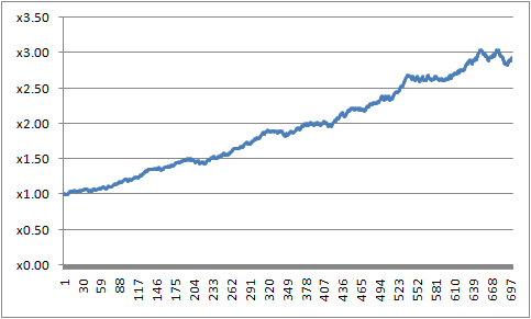 이 전략을 단순히 통계적으로만 따져 봤을 때 수익 그래프는 다음과 같습니다.