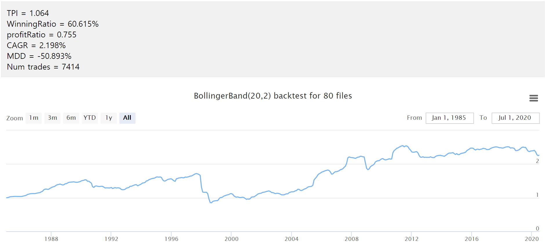 오늘은 추세추종에 이어 볼린저밴드를 활용한 매매전략 백테스트 도구를 업데이트하였습니다. (오랜만에 열정이 솟구치고 있습니다 ㅎㅎ 블로그에 여러 전략의 백테스트 도구를 올려두고 놀러 오시는 분들이 백테스트 놀이를 할 수 있도록 하려고 합니다 :D)