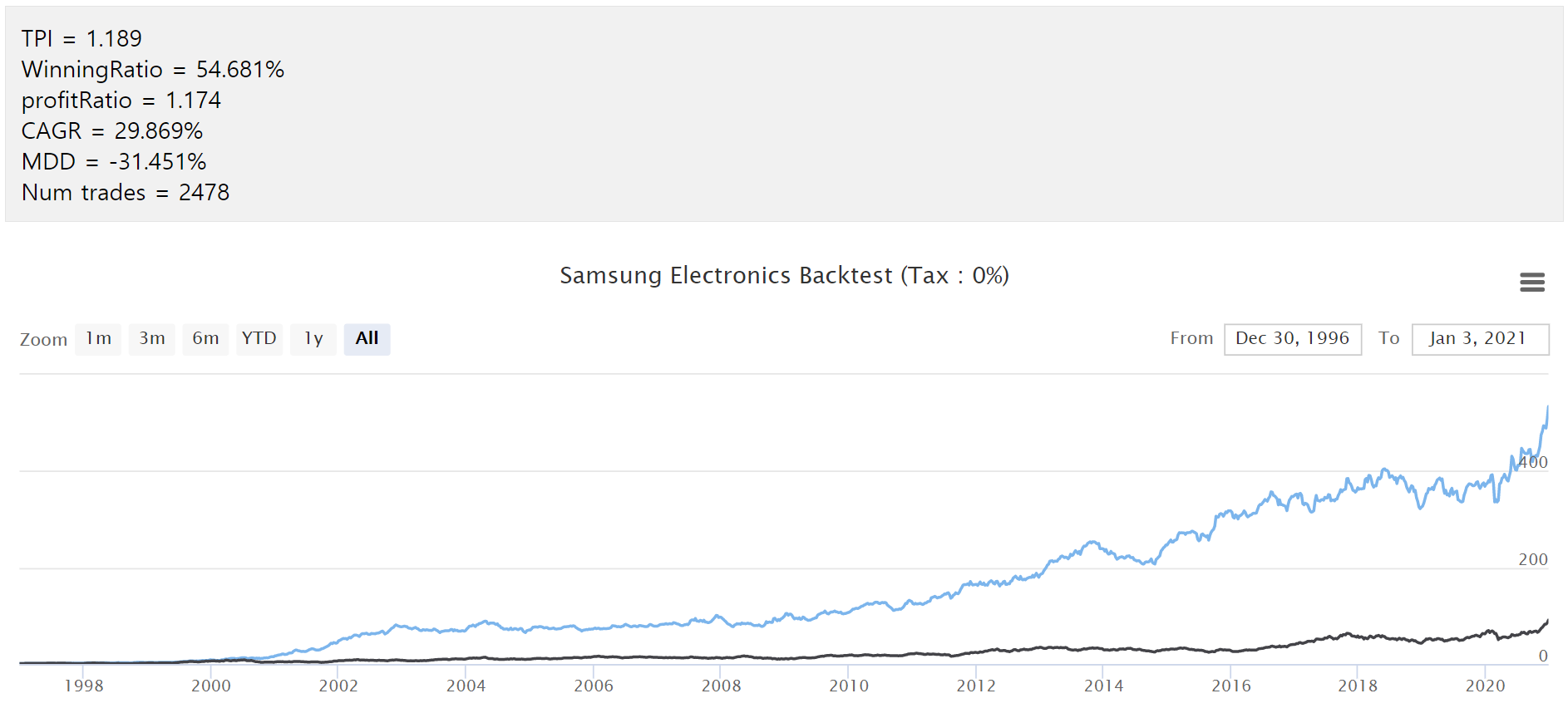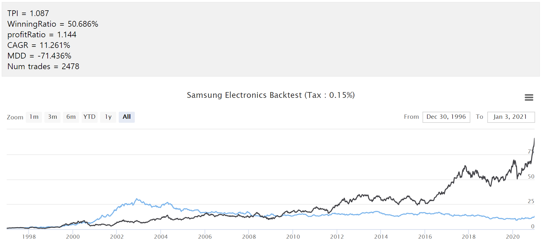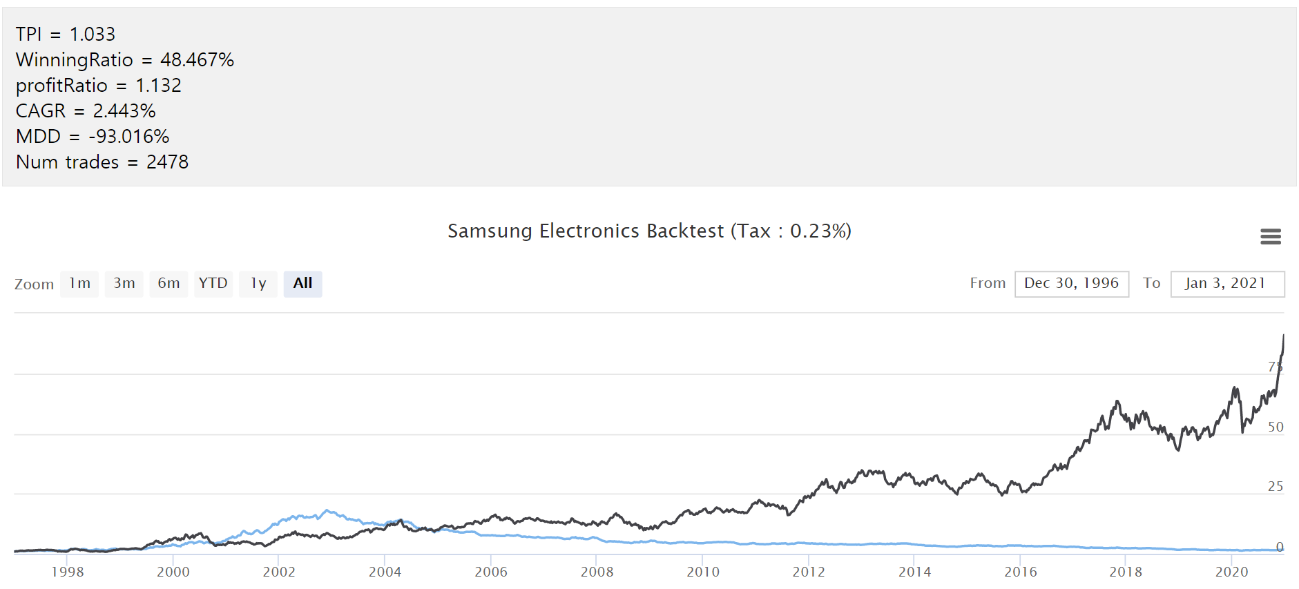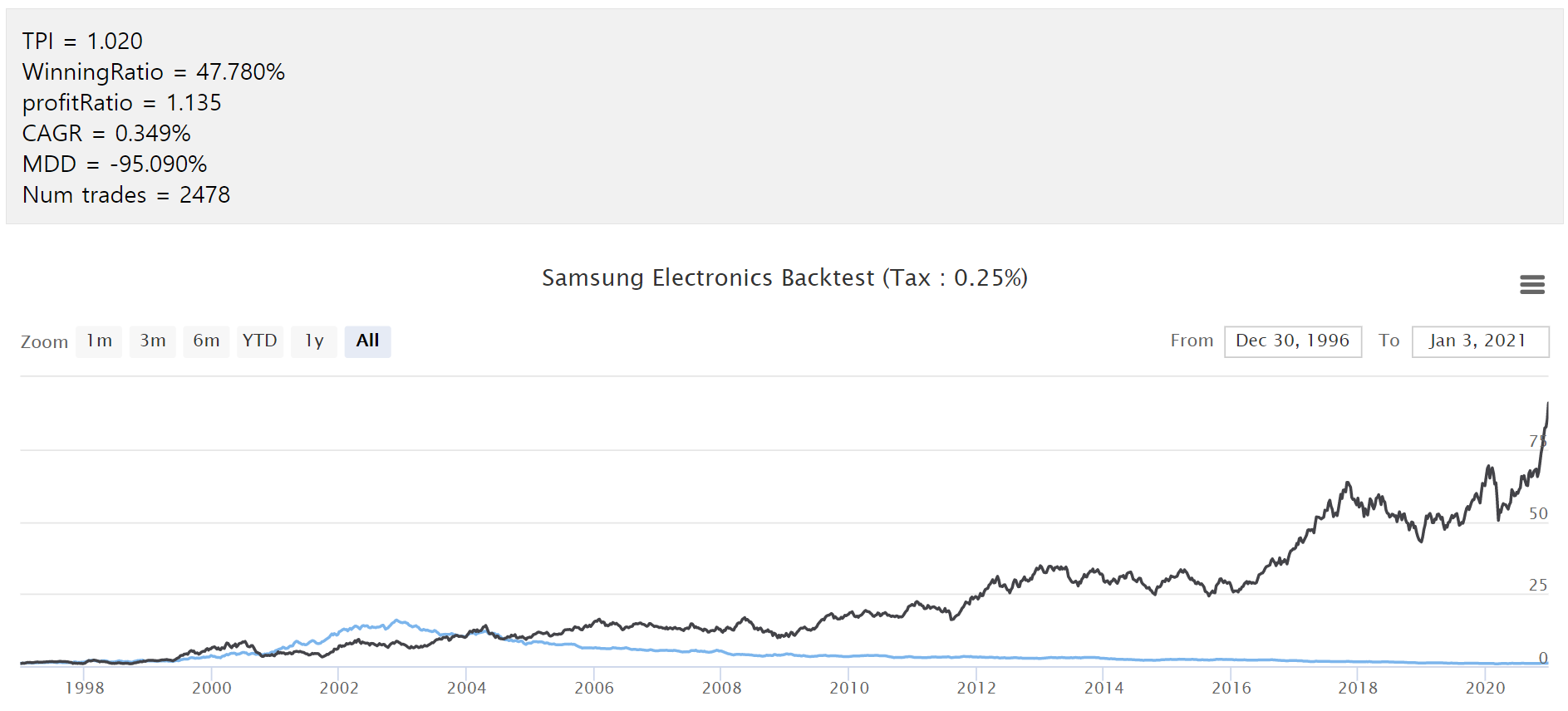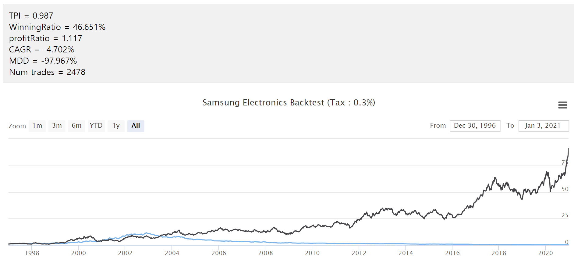 참고 : 검은 선은 삼성전자 주가이고 파란선이 백테스트 결과입니다. ㅜㅜ 정말 망해버렸습니다.