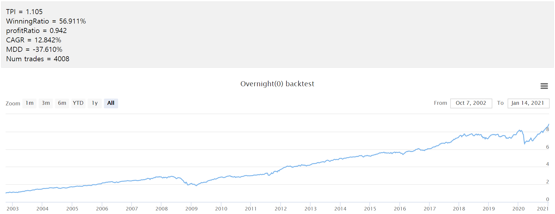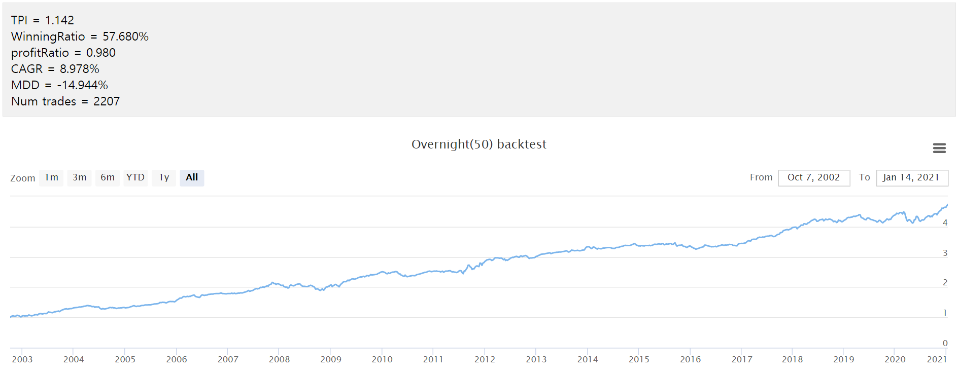 이렇게 range position을 활용하여 종가에 매수하게 되면 꽤 괜찮은 결과를 얻을 수 있답니다. 그럼 한번 결과를 볼까요?